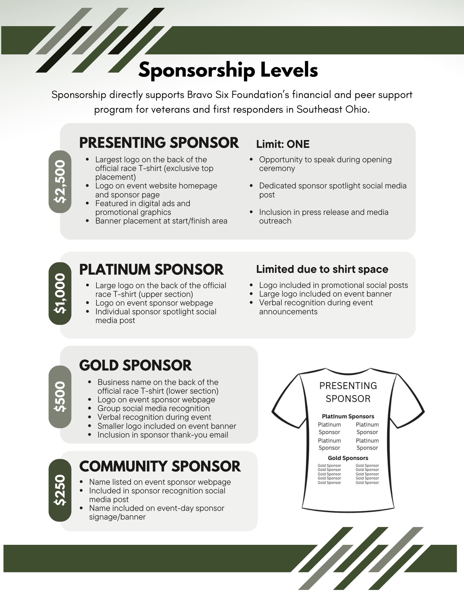 When you sponsor this event, your dollars stay right here in Muskingum and Guernsey counties supporting veterans and first responders in our own communities who are facing mental health challenges and real-life needs.